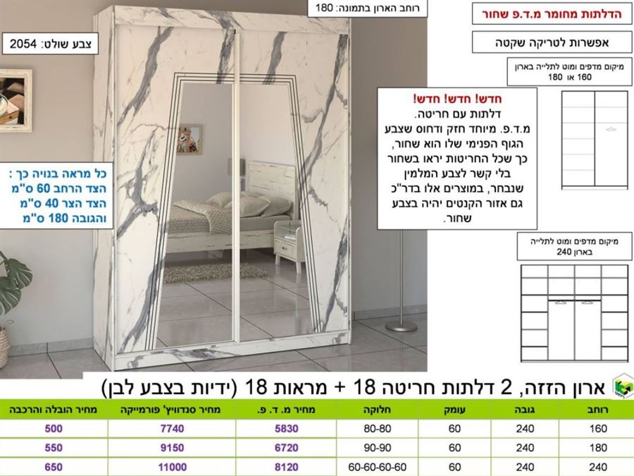 המחיר עבור ארון עשוי MDF רוחב 160 כולל מראות, ללא הובלה והרכבה